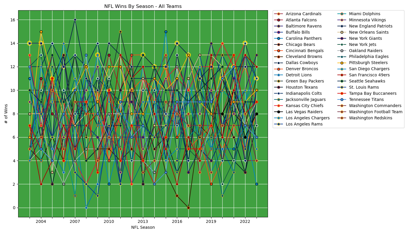 An interactive line graph visualizing the total number of wins by every NFL team from 2003 to 2023. Each team’s line uses their uniform colors, and their Super Bowl-winning seasons are marked in gold. The visualization has a dropdown menu to filter the results based off conference and division and the graph can be used to analyze and highlight trends in the league from the 2 decades it spans such as dynasties, slumps, and overall league parity.