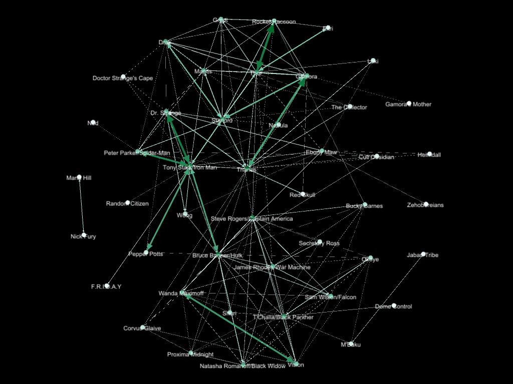 This project visualizes the character dynamics in Avengers: Infinity War using two large-scale network graphs. A narrative graph maps plot-driving interactions between the characters while a dialogue graph tracks who talks to whom. Graph theory metrics like centrality, betweenness, and embeddedness were then calculated and used to highlight and analyze the film's characters.