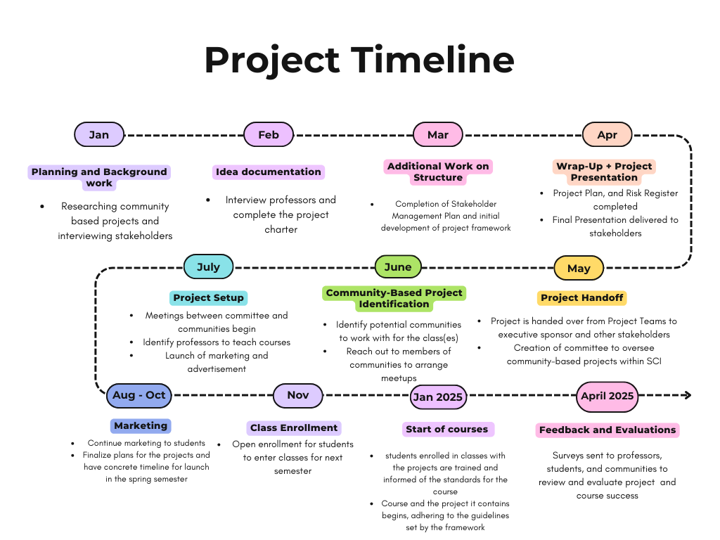 In our semester-long project for INFSCI 1460, our group developed and presented a structured framework to guide capstone courses that focused on community-based projects within the School of Computing and Information (SCI) at the University of Pittsburgh. With guidance from Associate Dean Rosta Farzan and Professor Leona Mitchell, our team developed resources for training, engagement, and risk management in courses supporting marginalized communities. Our deliverables included stakeholder management plans/interviews, a detailed risk register, a communication plan, a work breakdown sturcture, and a formal project charter for implementation by Spring 2025.